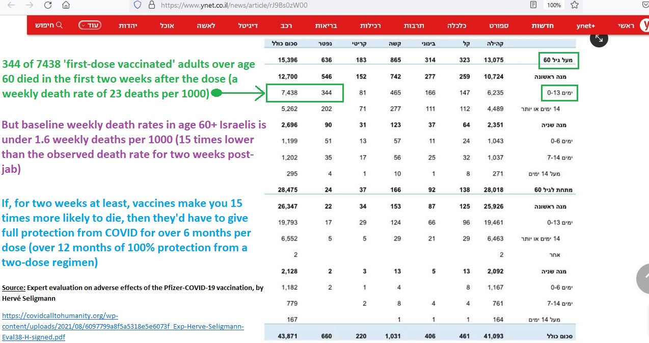 Herve Seligmann discovered that, in Israel, COVID vaccines are associated with really high death rates for a few weeks post-dose. To overcome the excess death associated with getting vaccinated, the two-dose vaccine protocol would have to fully (100%) protect you from COVID for over 12 months.