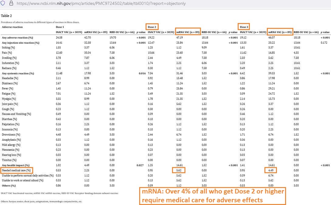 [over 4% of all who get Dose 2 of mRNA (or higher) require medical care] — Wang Y, Zhang Y, Zhang M, Zhang X, Li H, Wang Y, Wang W, Ji J, Wu L, Zheng D. The prevalence of adverse reactions among individuals with three-dose COVID-19 vaccination. J Infect Public Health. 2023 Jan;16(1):125-132. doi: 10.1016/j.jiph.2022.12.004. Epub 2022 Dec 6. PMID: 36516647; PMCID: PMC9724502. https://www.ncbi.nlm.nih.gov/pmc/articles/PMC9724502/