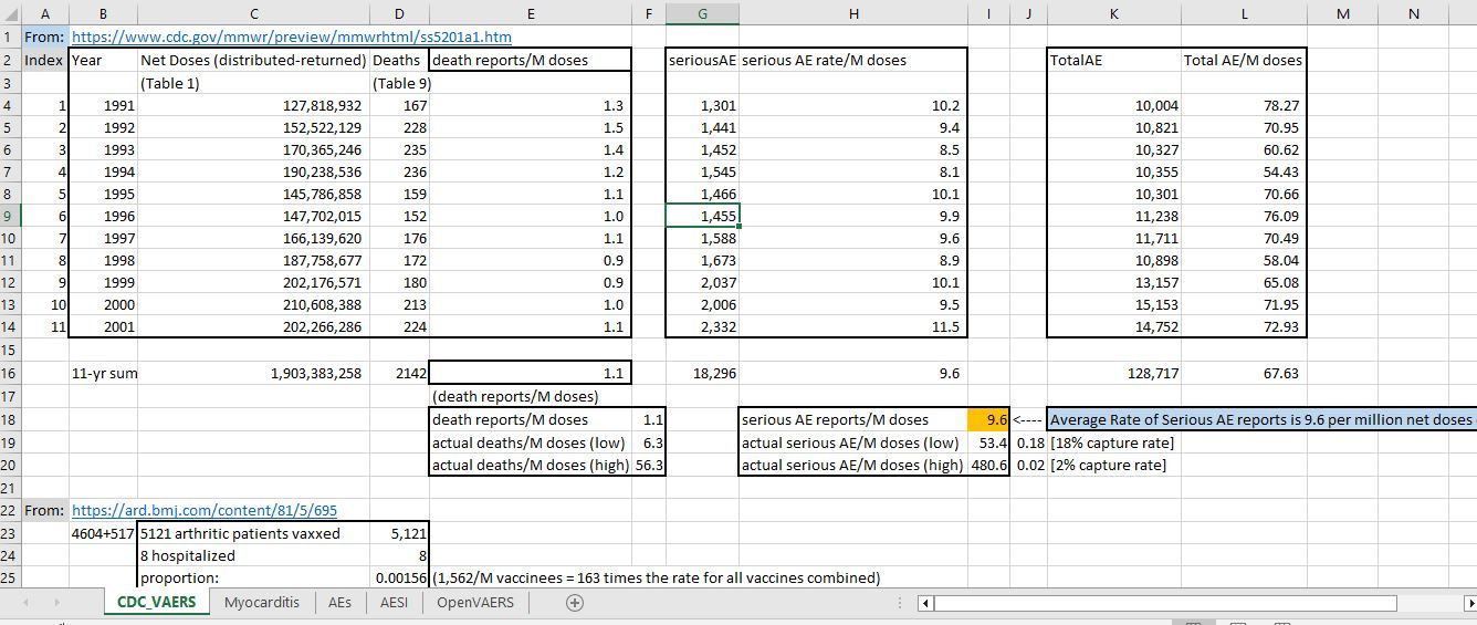 In cell I18 of the spreadsheet, you can see that the reporting rate of serious adverse events (AE) to the VAERS system is 9.6 serious AEs per million net doses distributed (distributed and not sent back).