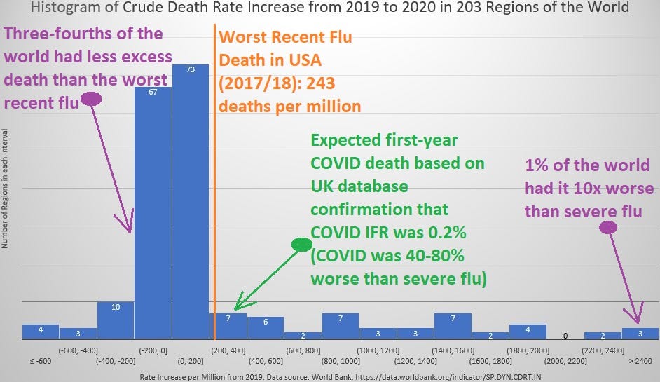 Most of the world saw death increases that would be less than what would be seen if the US flu experience of 2017/18 had been experienced worldwide. The extensive UK database confirmed in Jan 2021 that early variants of COVID were 40-80% worse than severe flu (COVID almost twice as fatal as flu).