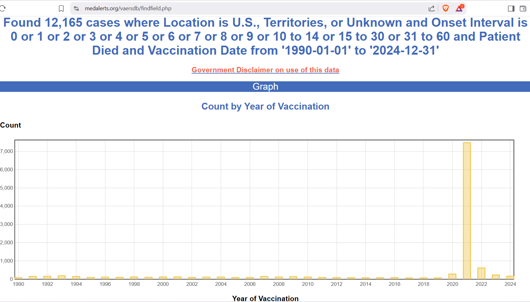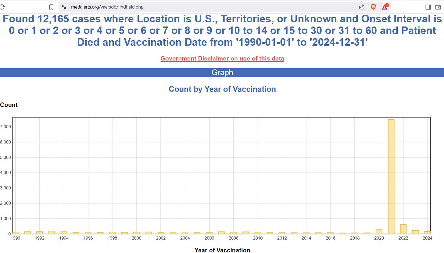 In other words, even though the highest fatal report count prior had been 189, somewhere from 567 - 945 yearly fatal adverse event reports would have been expected in 2021 -- but instead, there were 7,481 of them, more than 40x higher than the average of previous years: