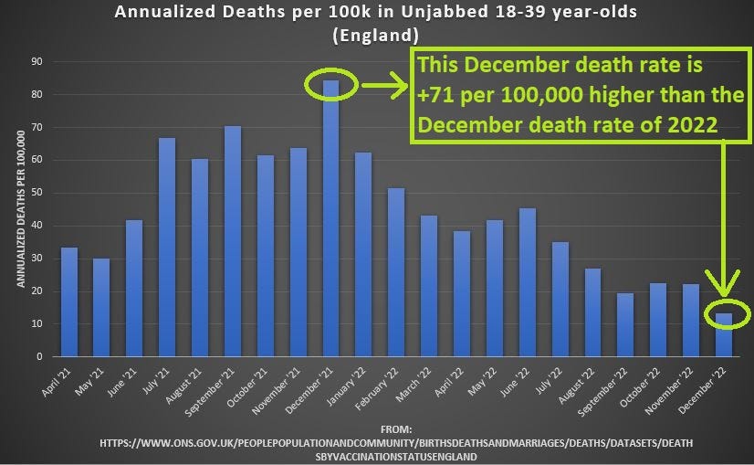 The death rate of the unjabbed young adults in England comes from a crude division of death count by person-years, from columns F and G of the cited source. Explaining the “difference-of-Decembers” is essentially impossible with COVID, considering the median infection fatality rate (IFR) of COVID for those of age 30-39: