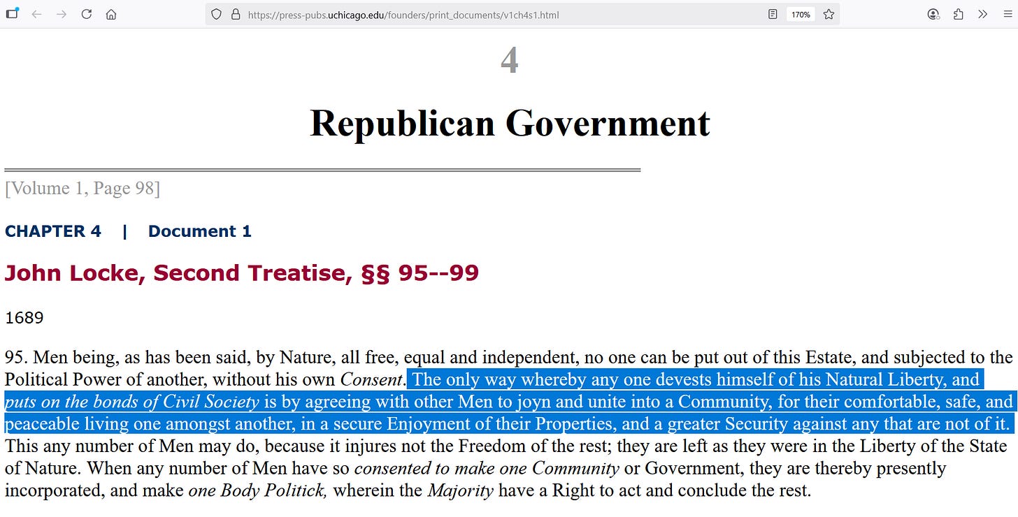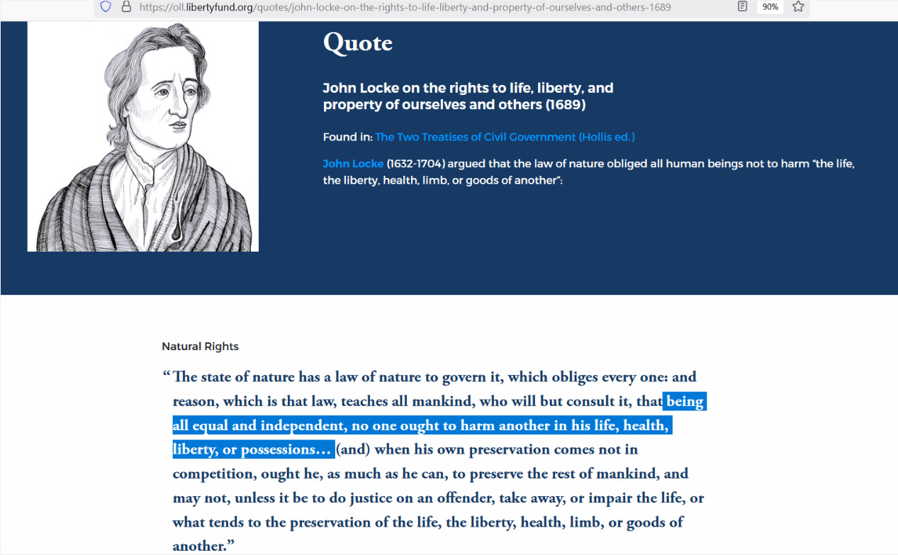 No one ought to harm or take another’s life. Our nation’s founders relied on the writings of philosophers such as John Locke. In the Federalist Papers, they explicitly said so. Have a look for yourself at something John Locke wrote: