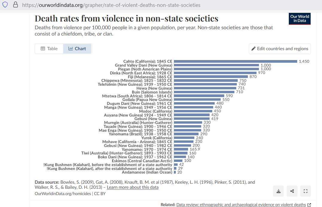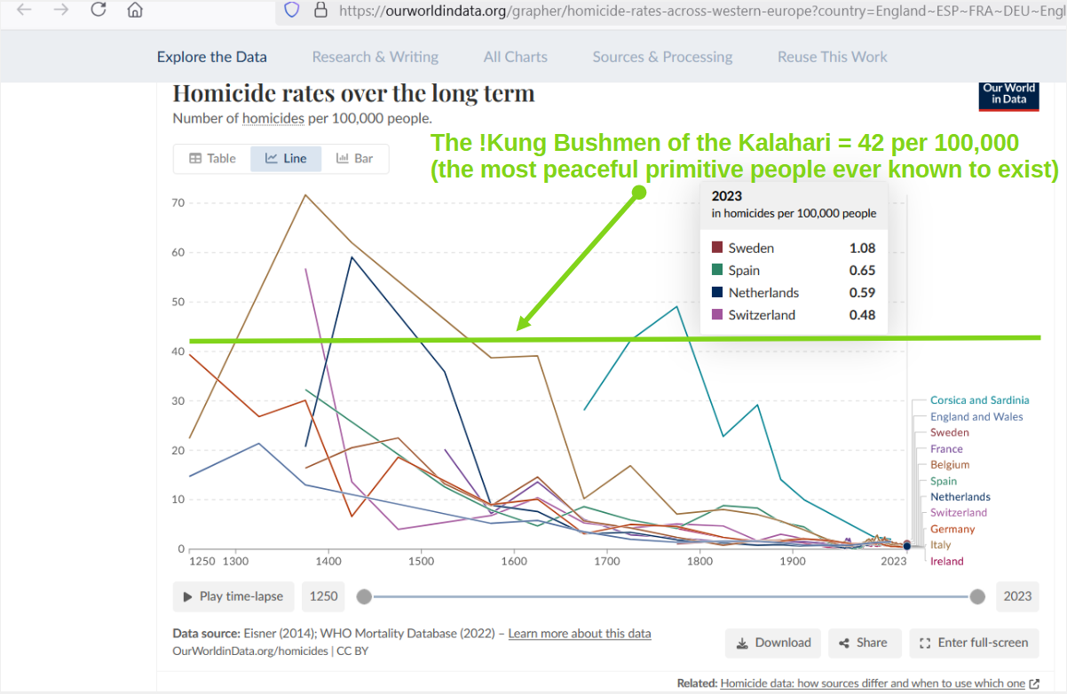 Besides one group of islanders (a very special case; confined in space), the !Kung Bushmen are the most peaceful non-islanders known to exist, having an original annual murder rate of 42 per 100,000. But check out what is possible when rights are respected, and that respect is enforced by living under a Rule-of-Law: