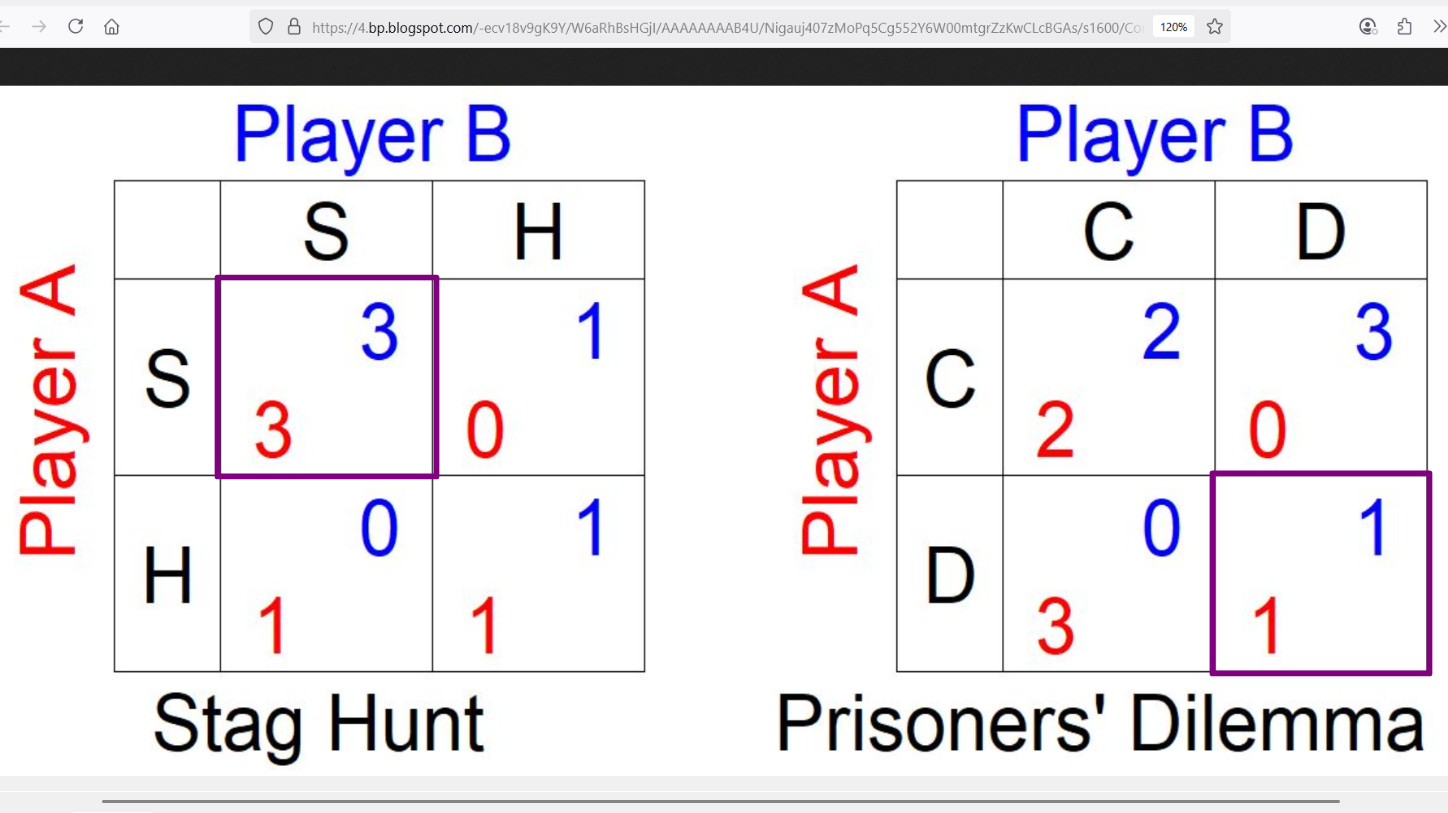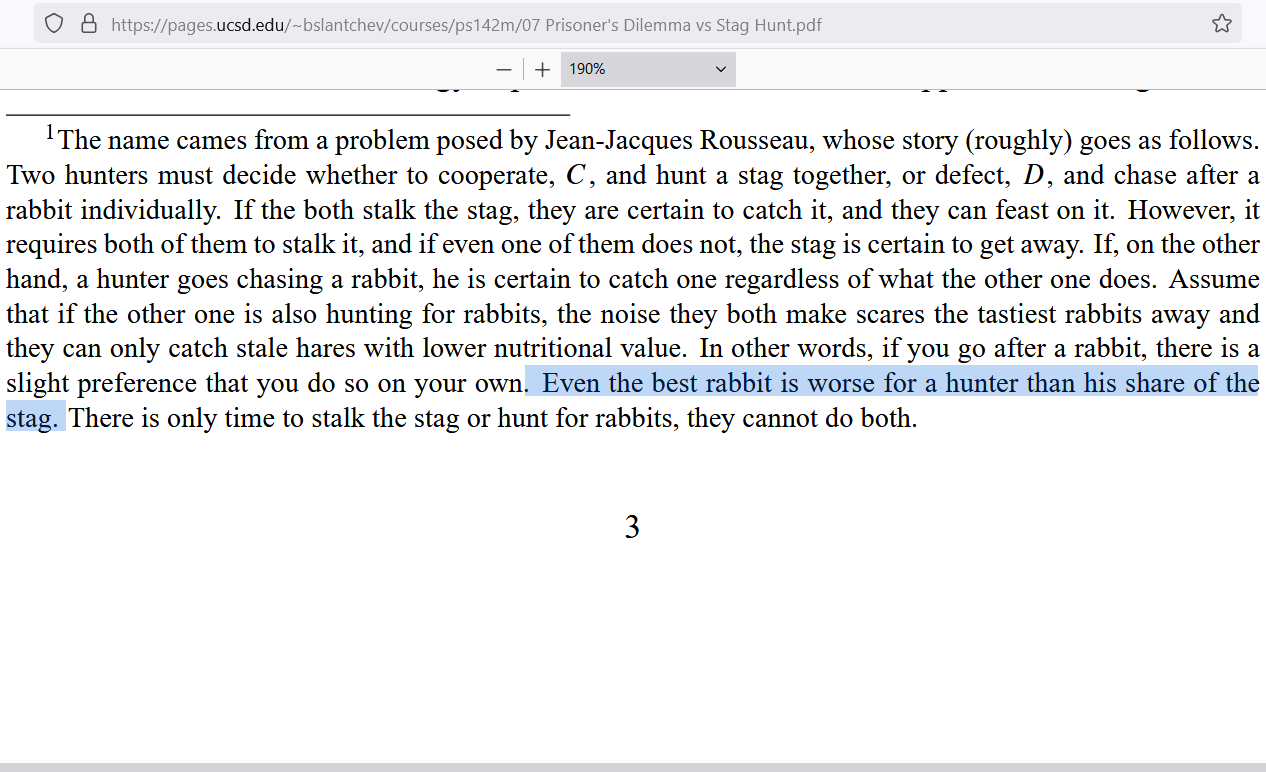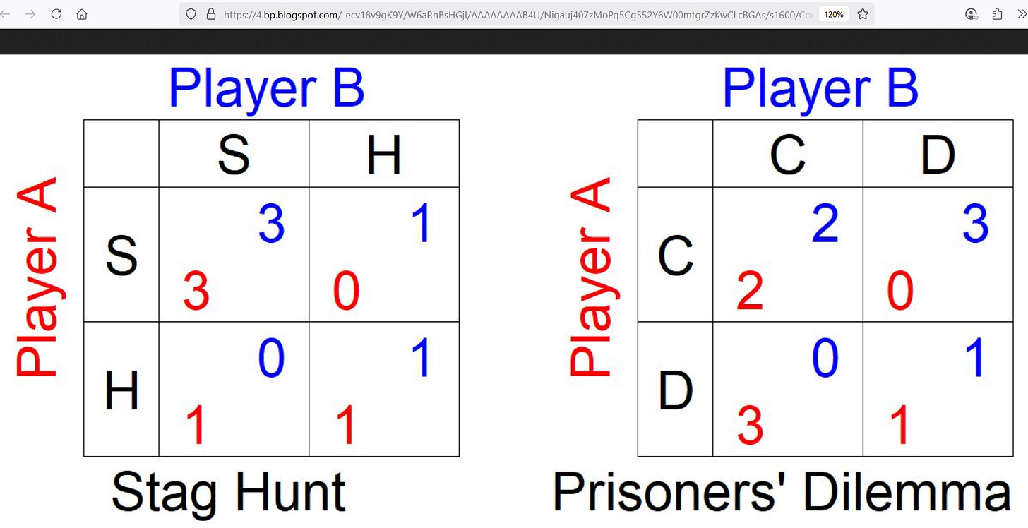 A “stag” is a deer and the philosopher, Rousseau, is assuming it takes human cooperation to catch one — people mutually agreeing to expend effort together for a prize. But the story reveals that a rabbit can be caught without cooperation, though it does not offer as much of a prize. Here’s a better depiction of the contrast in pay-offs: