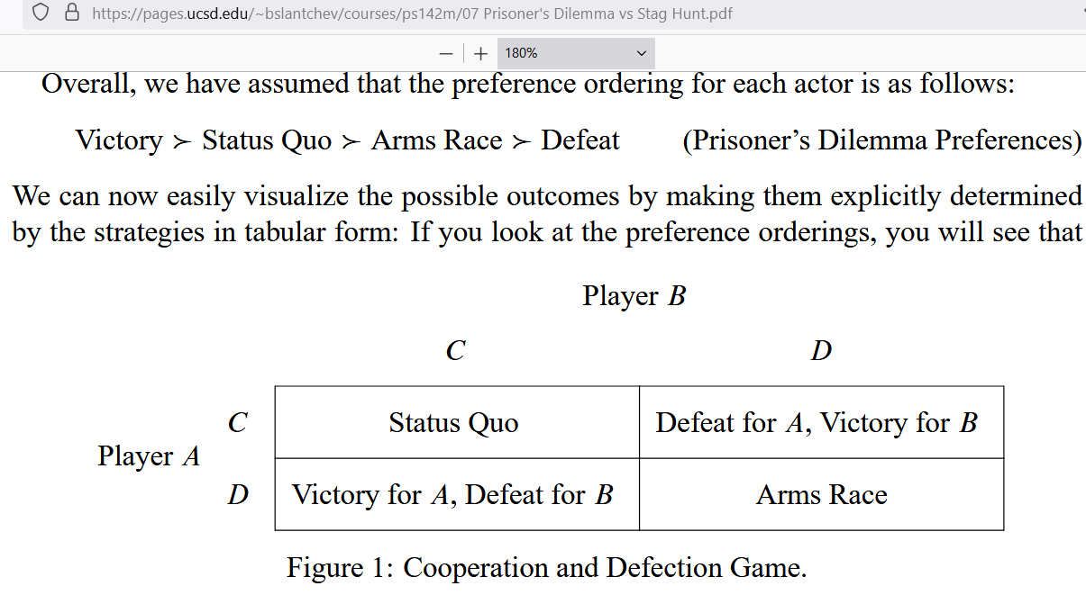 At top left where it says “Status Quo” is when two nations are “getting along” — and that comes with the second-highest pay-out, a pay-off which each nation enjoys. At bottom right where it says “Arms Race” is when two nations keep putting more and more of their resources into tanks and battleships, rather than necessities like food.