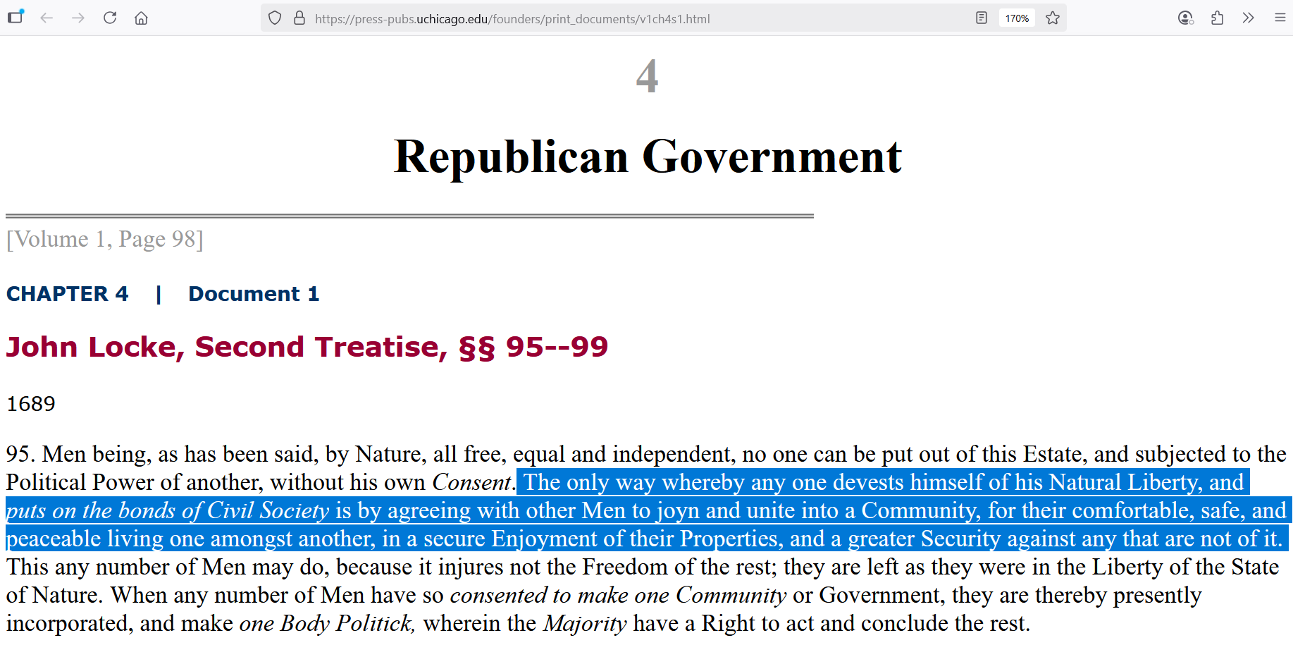 Locke is talking about the original setting-up of a government, and how it is being set up for some very specific purposes. The reasons humans create government are for things like Unity, Comfort, Safety, Peace, Enjoyment, Personal Property, and Security from potential invaders. Where have we seen those concepts before? Oh, I know, here: