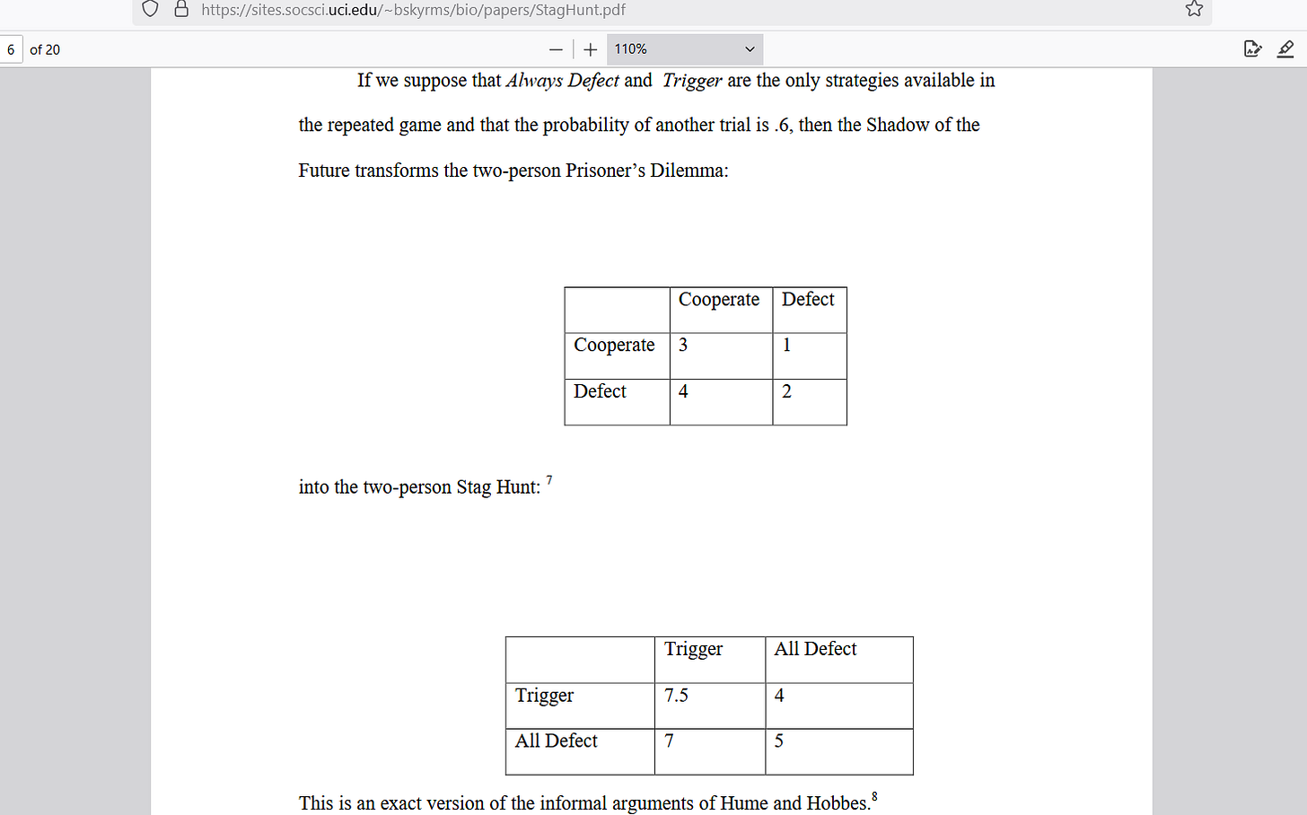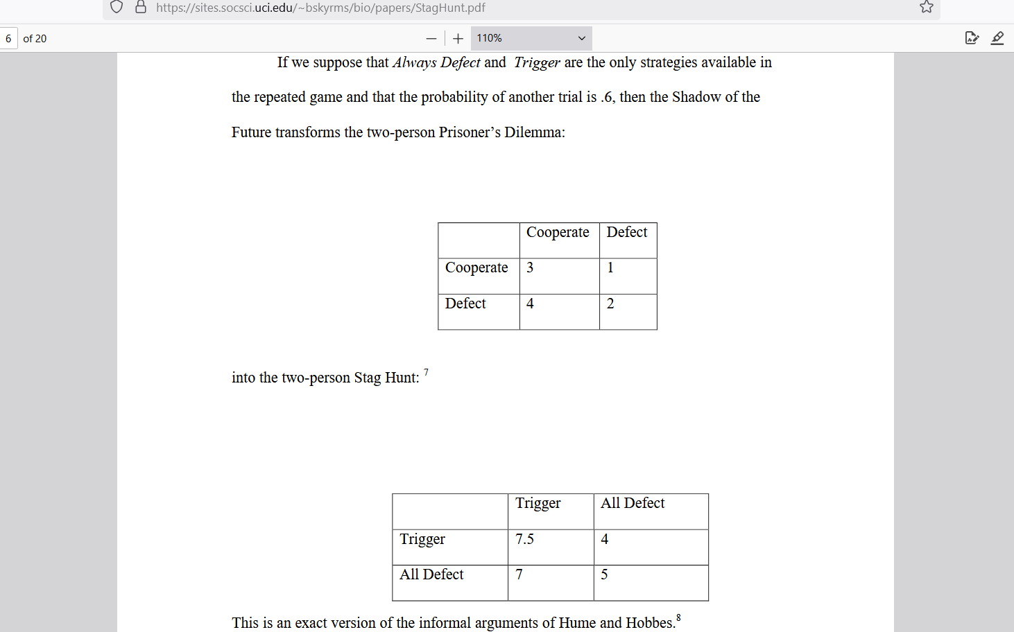 These pay-off numbers allow you to compare the results of the combined choices of both players and the “Trigger” at bottom means you cooperate and only defect when the other guy did in the last round. The second game, the one that humans truly face when they interact with each other under a Rule-of-Law, has a funny name: “Stag Hunt."