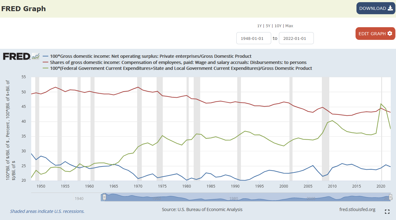 Though the color scheme of the lines above was by happenstance, in both 2020 and in 2021, the government had “crossed a red line” — i.e., it had gone too far — and had become the primary economic actor by way of allocating more total resources than any competing group (such as the 161 million American workers getting paychecks).