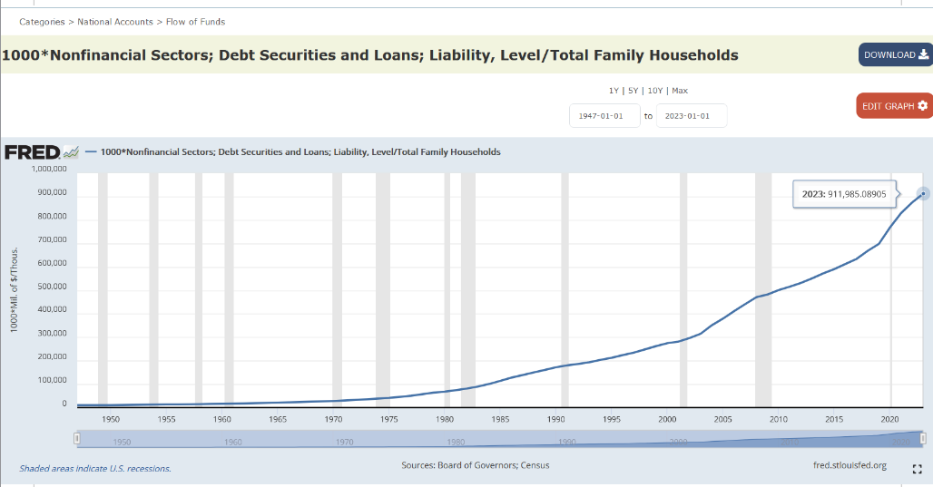 Because too may U.S. civilians have been waffling over whether government spending and centralized control should be cut way back (to levels not seen for over half a century), we are ending up like those Banana Republics which had to go through debt crises. In fact, we now have over $900,000 of total* debt per U.S. family: