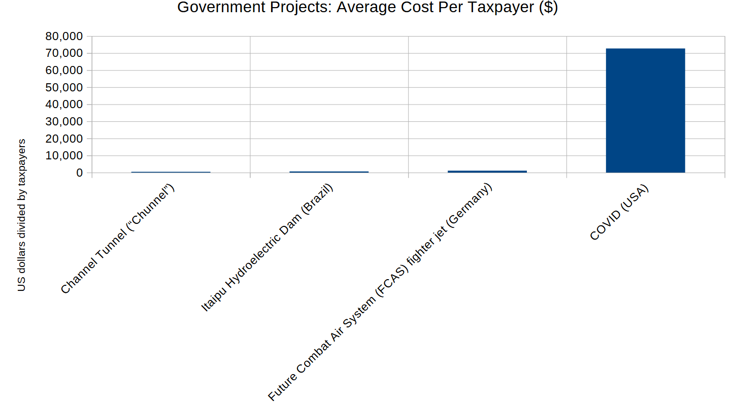 When you sum up the blue subtotals, then you discover that the government spent $11.475 trillion on COVID. But how much is that per U.S. taxpayer? Here is a side-by-side contrast of 3 historic government projects — the channel tunnel between England and France, a dam in Brazil, and a jet in Germany — along with the COVID “project”: