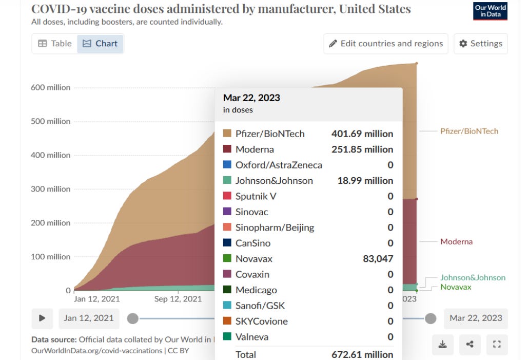 At 3,945 reports of Bell’s Palsy, no other type of vaccine even comes close to COVID shots (e.g., Shingles vaccines from 1991 to 2023 had a grand total of 85). The reporting rate for Bell’s Palsy can be found after discovering how many total COVID shots went out in the USA up to March 2023: