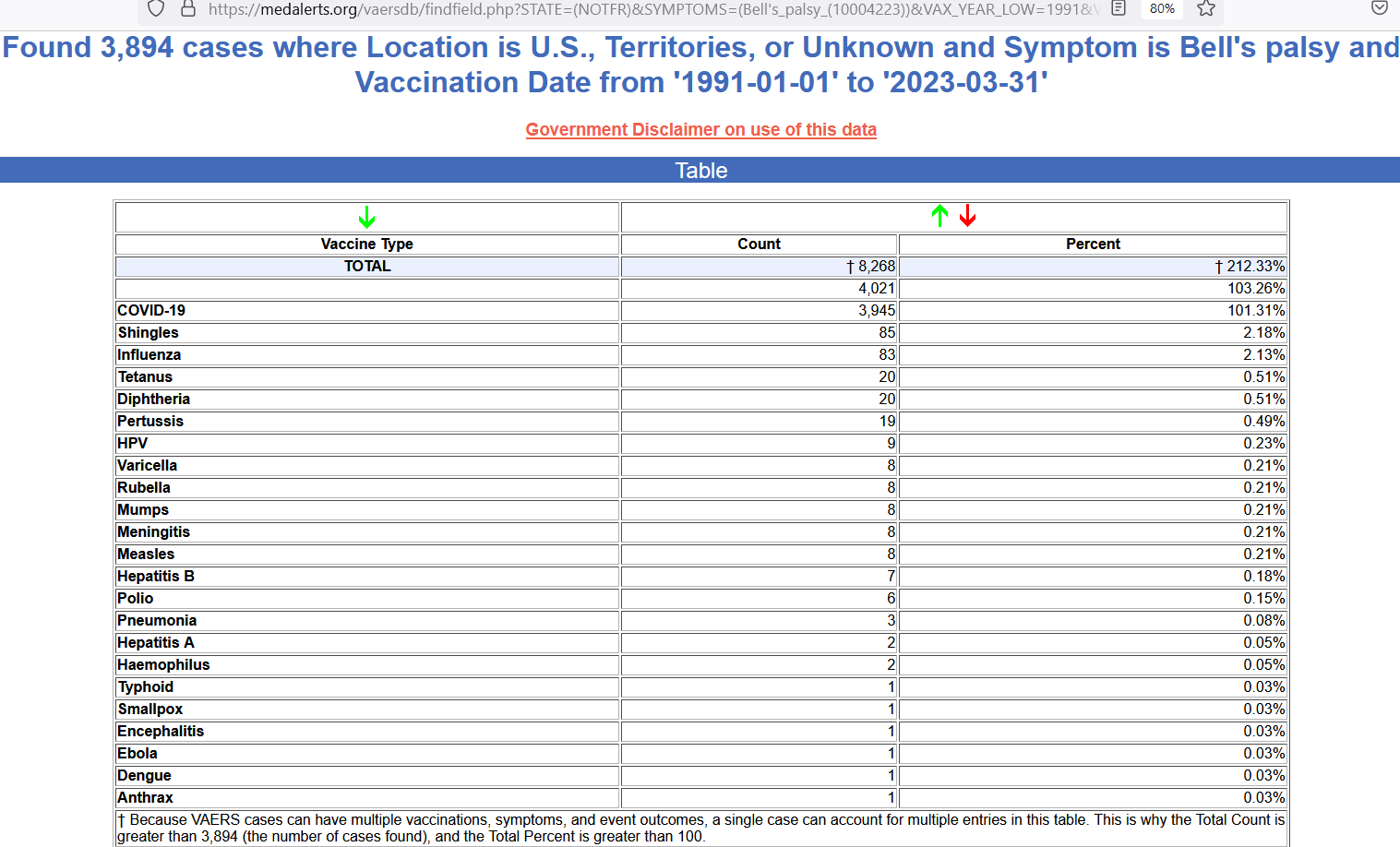 The note at bottom reveals that some “double-reporting” occurs due to people having had more than one vaccine type, or more than one event type — explaining why the grand total is 103.26%, rather than 100.00% like it is supposed to be. This means that about 3% of the total had been “double-reported” — while 97% was fully-accurate.