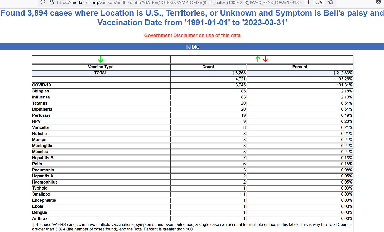 recently commented on Bell’s Palsy with COVID shots.When researchers analyzed the top four phase 3 trials for COVID shots, they found significantly-elevated risk for Bell’s Palsy, though CDC does not overtly advertise the elevated risk, choosing to instead focus on myocarditis. Here are the VAERS reports from Jan 1991 up to Mar 2023 for Bell’s Palsy: