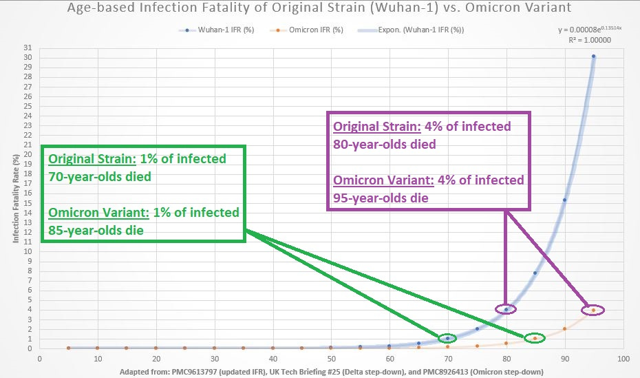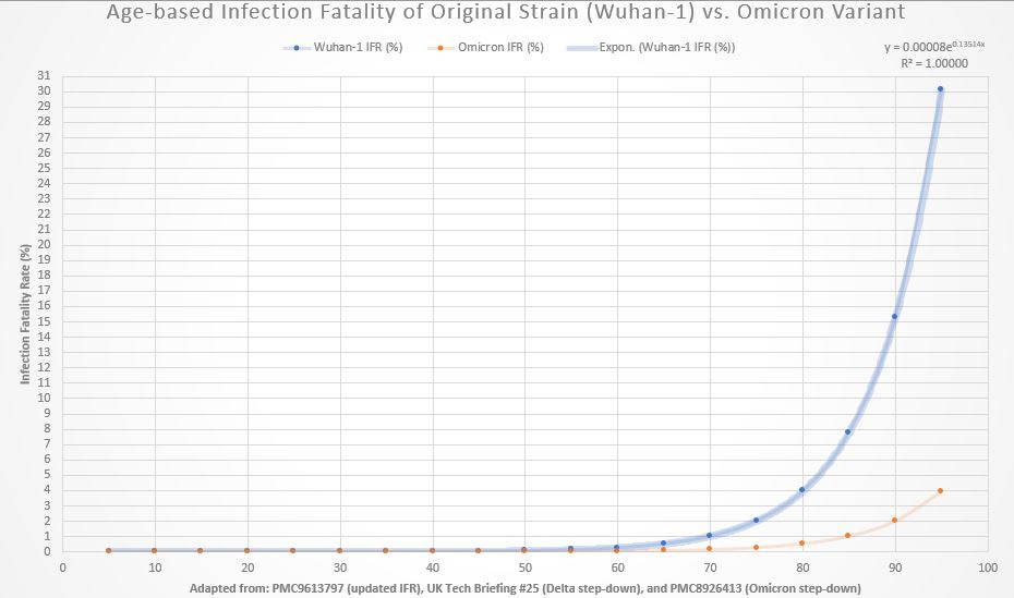 That’s the function which fitted the original strain median IFR estimates the best. After obtaining the original strain IFR, convert to Omicron by multiplying it by 0.1302 — or simply use the converted form of the function for Omicron: