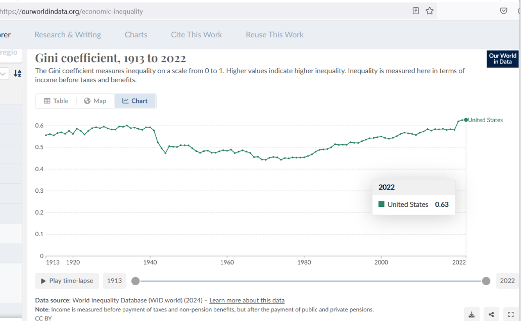 North America in 1900 had the least inequality in the entire world. But now that government has grown in the USA, making us more like the rest of the world, the inequality — measured by a pre-tax gini coefficient — is rising to heights never witnessed before in America: