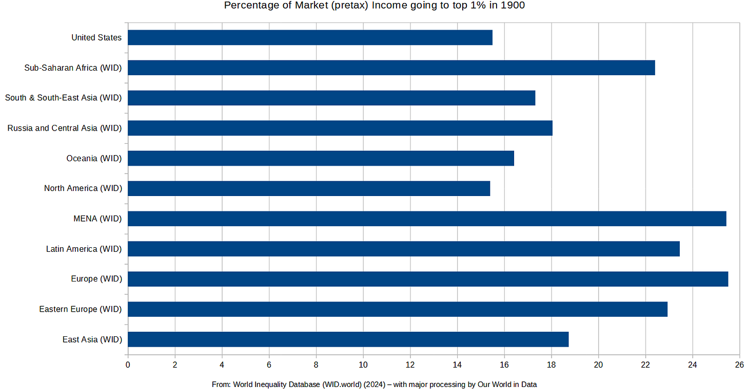 When they earn over 20% — e.g., UK was at 31% in 1900 — it just means that they cut a deal with the government in order to extract wealth at a level that was beyond their productivity. History shows that the top 1% are about 16 times more productive than average, so, if they are paid what they are worth, they’ll earn about 16% of all income.
