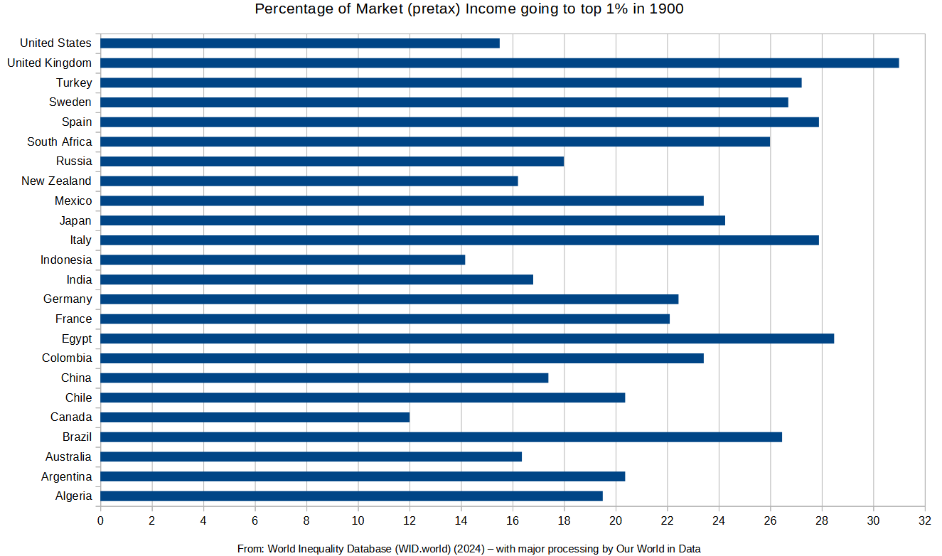 But in 1900, it can be argued that the USA was the “most-free” economy in the world, with the most unobtrusive government of the developed nations — as the graph above indicates. But when you examine the share of market income (income before tax) that went to the top 1% back in 1900, then you find that the USA was almost the very best: