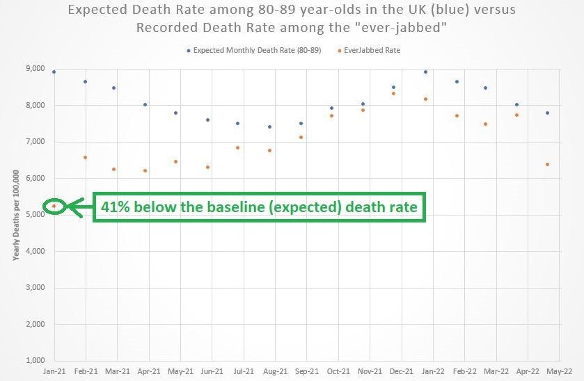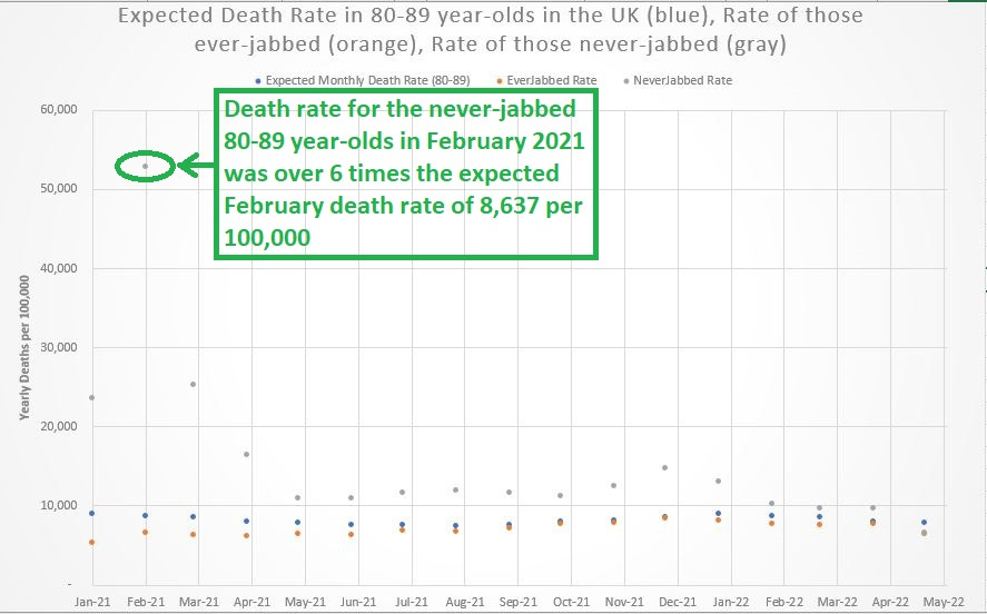 The likely explanation for the 6-fold increase in death in the never-jabbed 80-89 year-olds in the UK is actually a misclassification of jabbed deaths — calling them “unjabbed deaths” simply because they occurred prior to a time when the government would be willing to admit that the person had been “vaccinated.”