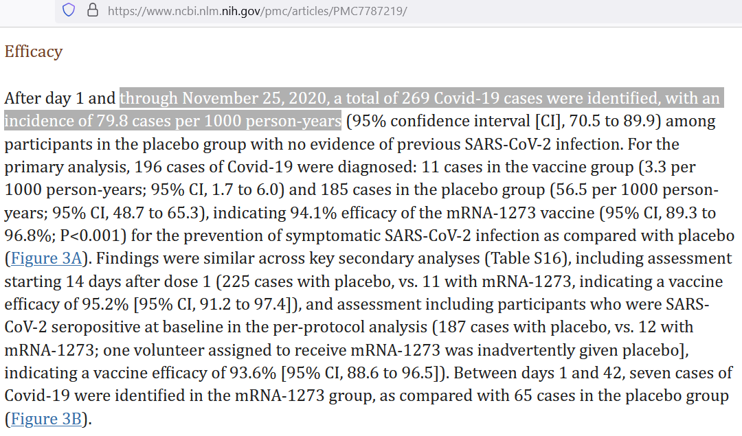 The higher annualized attack rate for COVID in the placebo groups of original trials came from the original Moderna trial, and it was found to be 8% a year (79.8 per 1,000 person-years):