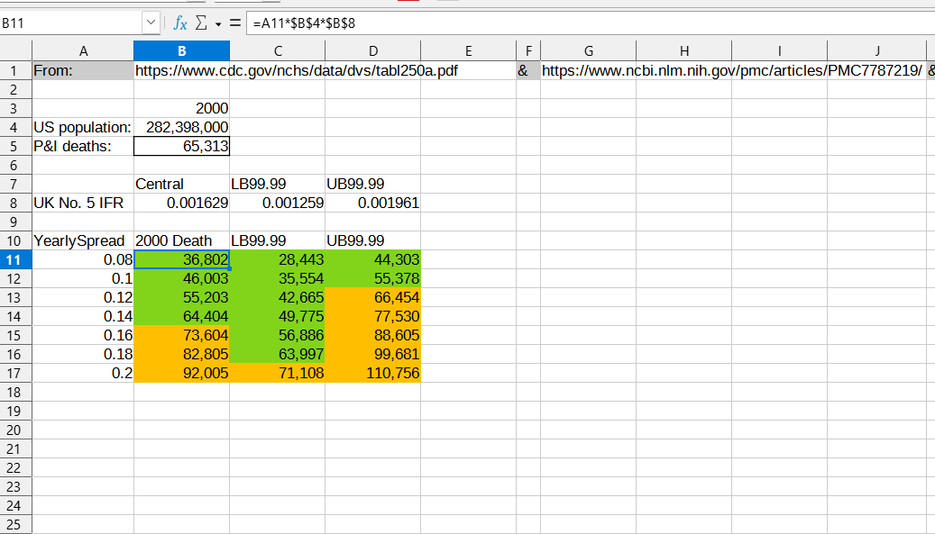 In cell B11 is the central estimate of the COVID IFR, at an annual 8% attack rate, resulting in a total of 37,000 COVID deaths in a year (just over half of the actual P&I deaths found back in 2000). Also showing is the 99.99% credible interval from a 150-million-round computer simulation of the UK death data to 19 Jan 2021.
