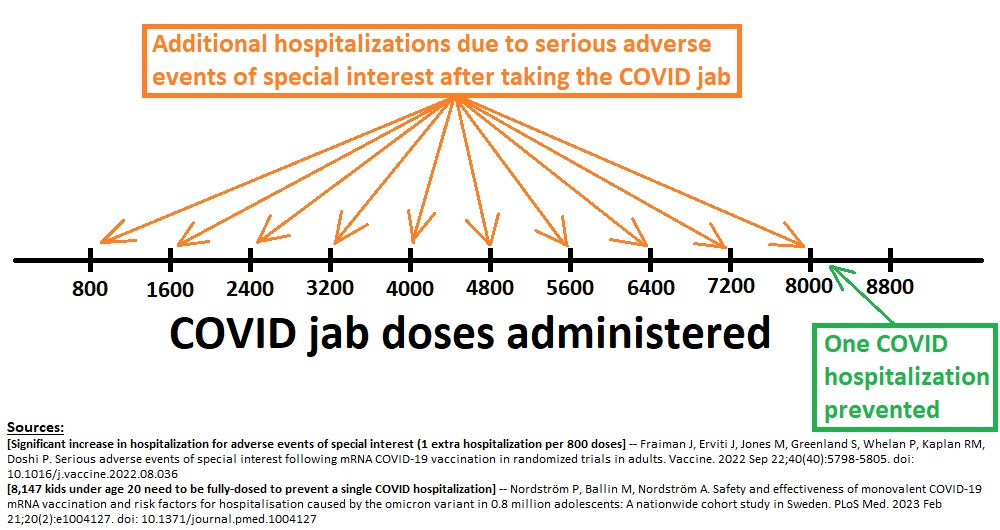 [8,147 fully-dosed kids are required to prevent a single COVID hospitalization] — Nordström P, Ballin M, Nordström A. Safety and effectiveness of monovalent COVID-19 mRNA vaccination and risk factors for hospitalisation caused by the omicron variant in 0.8 million adolescents: A nationwide cohort study in Sweden. PLoS Med. 2023 Feb 21;20(2):e1004127. doi: 10.1371/journal.pmed.1004127. PMID: 36802397; PMCID: PMC9990916. https://www.ncbi.nlm.nih.gov/pmc/articles/PMC9990916/