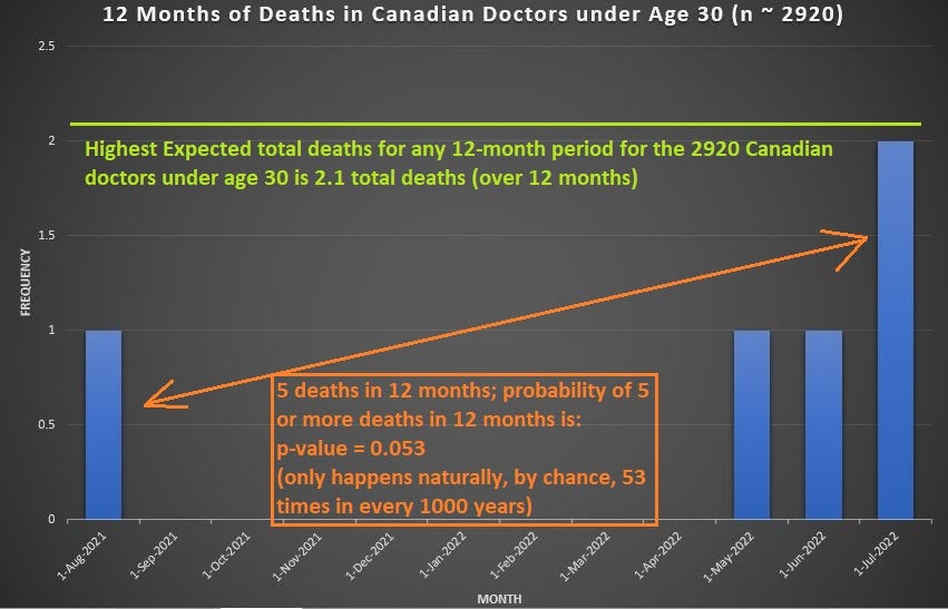 In the last Substack, I made an error when computing probability of observing 5 events when the mean rate is 2. The actual probability for there to have been 5 deaths among young Canadian doctors in a 12-month span is 0.053.