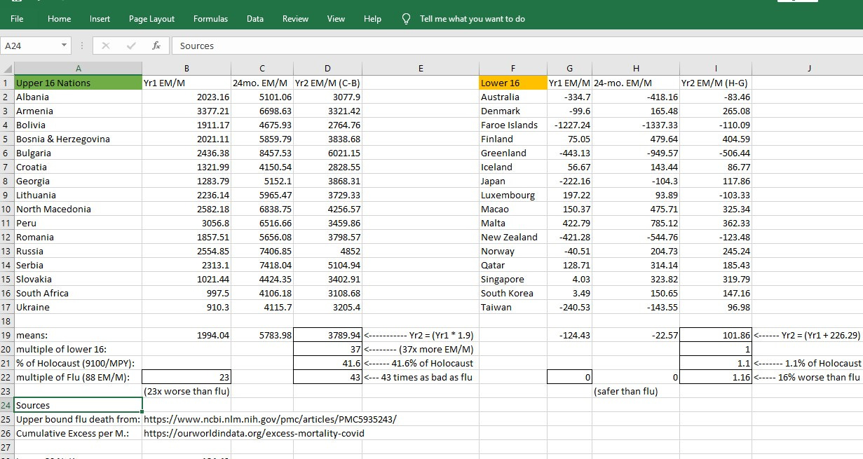 The Excel worksheet below has the top 16 nations (green) found in the OWID database reporting cumulative excess mortality per million (EM/M).