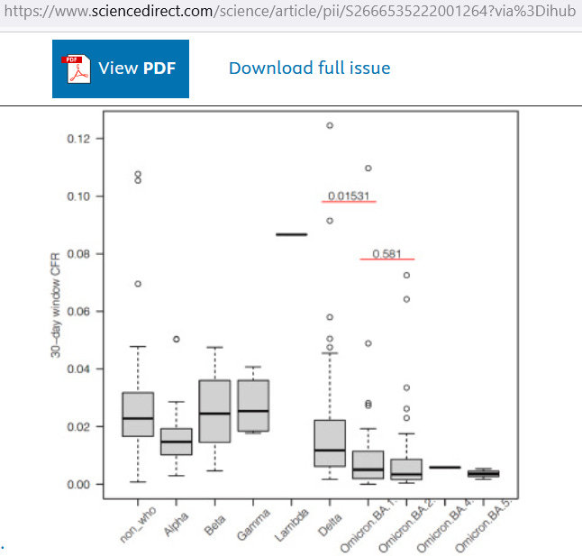 [Omicron is up to 20% as lethal] — Differences in case-fatality-rate of emerging SARS-CoV-2 variants. Public Health in Practice. Volume 5, June 2023, 100350. https://doi.org/10.1016/j.puhip.2022.100350