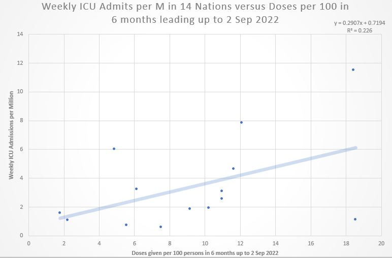 This current Substack extends the analysis to 15 total nations with jab data and ICU admissions data at or near 2 Sep 2022. Here are the overall results: