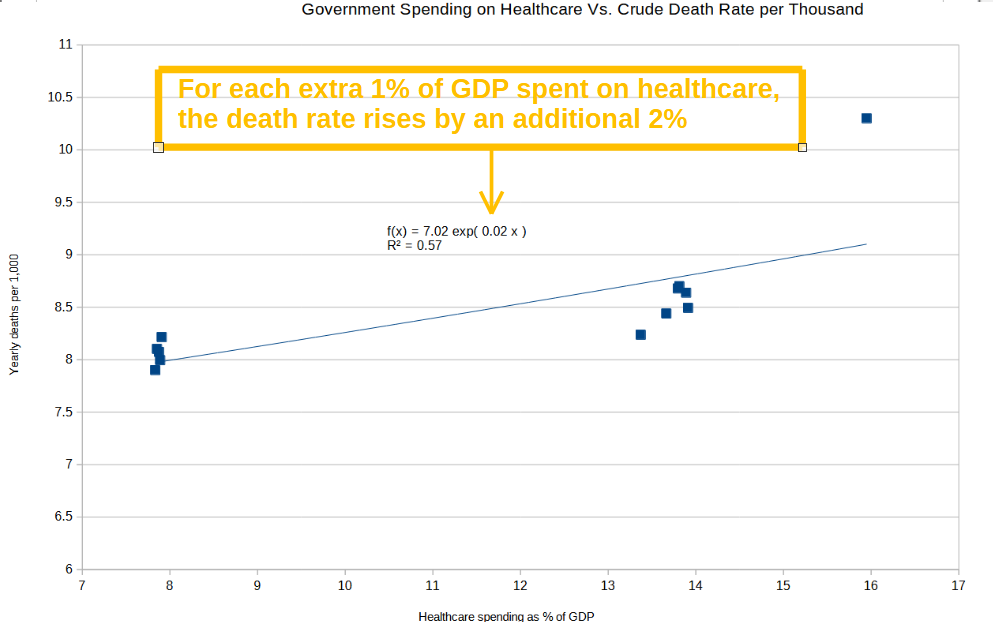 To test the hypothesis that “their spending is killing us” an exponential regression of spending and crude death rate was made for the years from 2009 to 2020, where 57% of the variation in the yearly death rate was explained by government spending on health: