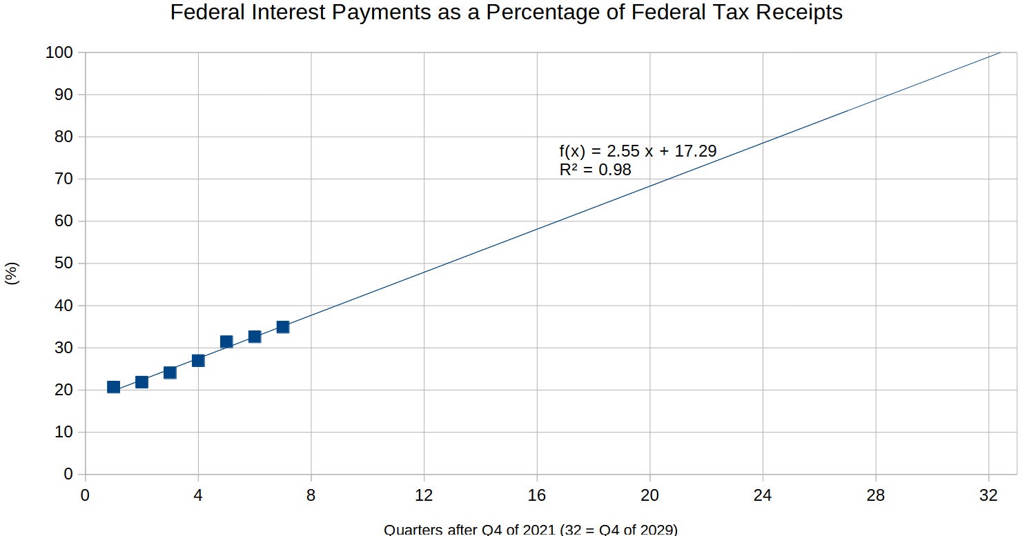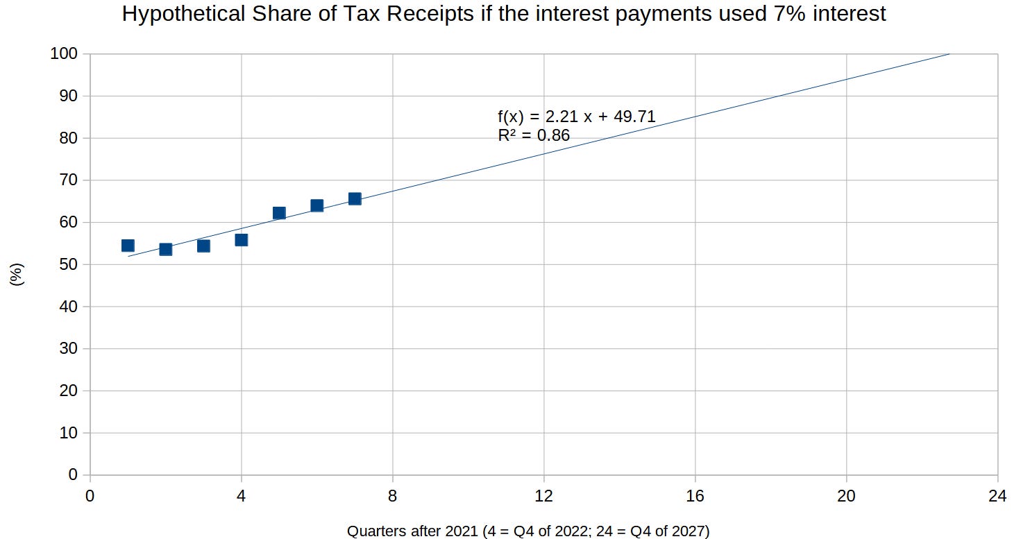The first data point at left is Q1 of 2022, so the share shown at left is that which would have been, had the interest on the debt already hit 7%. The entire regression uses 7% throughout, so the rise of 2.21% per quarter is based simply on the rising load that the raw debt comprises based on the tax receipts.