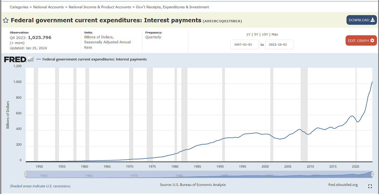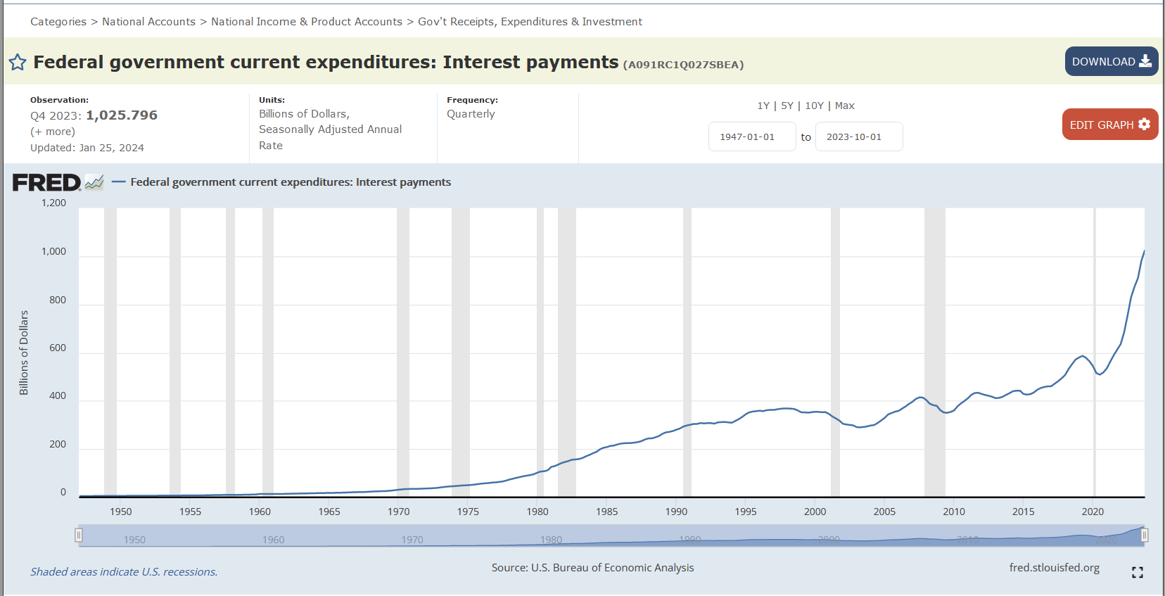 U.S. Bureau of Economic Analysis, Federal government current expenditures: Interest payments [A091RC1Q027SBEA], retrieved from FRED, Federal Reserve Bank of St. Louis; https://fred.stlouisfed.org/series/A091RC1Q027SBEA