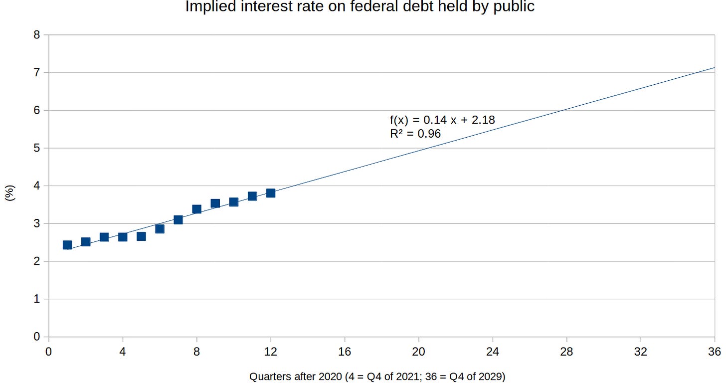 This graph attempts to back-compute the interest rate on the debt from the federal interest payments and the debt held by the public at the time. Notice how the regression equation makes it so that, every 7 years, an extra percentage point of interest is tacked onto the federal debt. By 2029, the interest rate surpasses 7%.