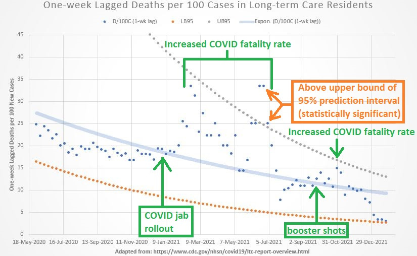 recently reported about, COVID fatality in U.S. nursing homes rose whenever new COVID injections were given — which is consistent with the hypothesis that COVID jabs increase COVID death.I independently analyzed the data and come to the same conclusion: the temporal association of COVID jabs with fatality rates indicates that jabs cause net harm.