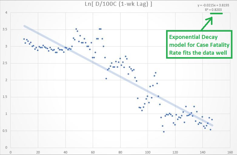 Using the natural log of the case fatality rate on a one-week lag, I verified that the one-week lag and the exponential decay model (which were both used by Steve in his original analysis) were both statistically valid: