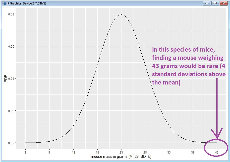 The probability of negative weight is zero. In other words, it can be known, before even looking at another sample of mice, that mouse weights will not be negative. Notice how you get to a weight of zero even within 5 standard deviations of the mean weight of 23 grams!