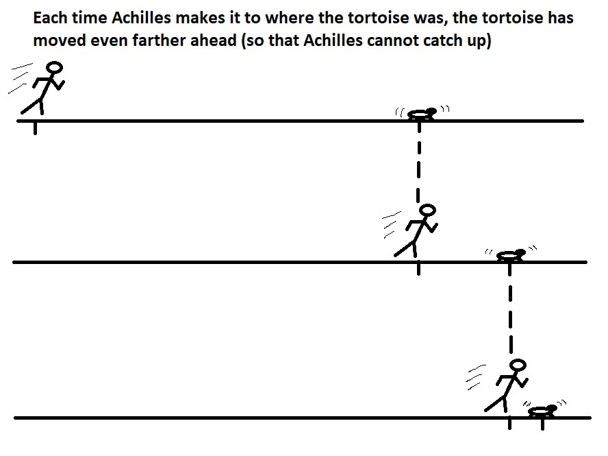 A paradox ascribed to the ancient Greek thinker, Zeno, states that, if the fastest runner known at the time (Achilles) raced a tortoise, and the tortoise had a head start, then Achilles would never catch up.