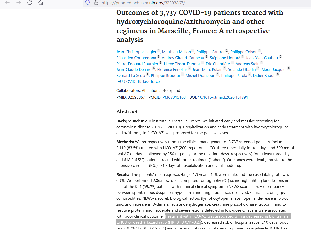 [almost 4,000 patients found to do much better on HCQ+AZM in France] — Lagier JC, Million M, Gautret P, Colson P, Cortaredona S, Giraud-Gatineau A, Honoré S, Gaubert JY, Fournier PE, Tissot-Dupont H, Chabrière E, Stein A, Deharo JC, Fenollar F, Rolain JM, Obadia Y, Jacquier A, La Scola B, Brouqui P, Drancourt M, Parola P, Raoult D; IHU COVID-19 Task force. Outcomes of 3,737 COVID-19 patients treated with hydroxychloroquine/azithromycin and other regimens in Marseille, France: A retrospective analysis. Travel Med Infect Dis. 2020 Jul-Aug;36:101791. doi: 10.1016/j.tmaid.2020.101791. Epub 2020 Jun 25. PMID: 32593867; PMCID: PMC7315163. https://pubmed.ncbi.nlm.nih.gov/32593867/