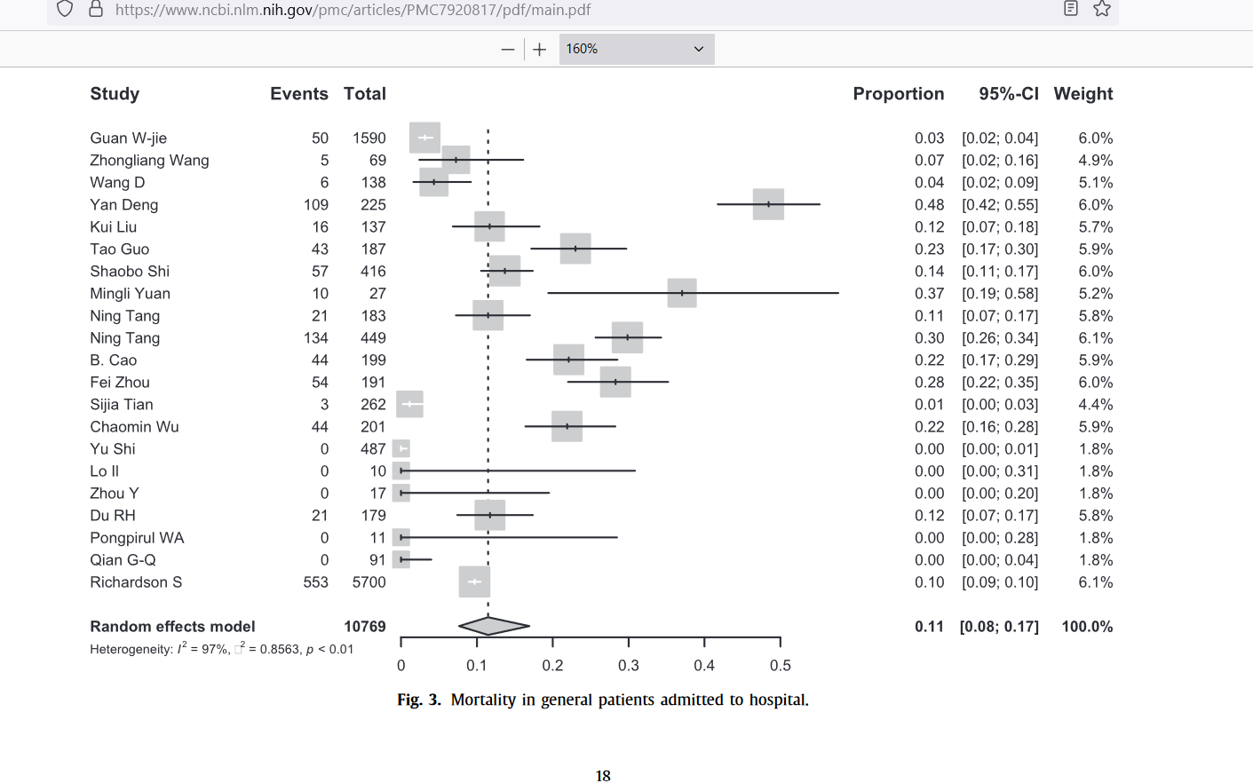 [hospital death rate for COVID in 2020] — Macedo A, Gonçalves N, Febra C. COVID-19 fatality rates in hospitalized patients: systematic review and meta-analysis. Ann Epidemiol. 2021 May;57:14-21. doi: 10.1016/j.annepidem.2021.02.012. Epub 2021 Mar 2. PMID: 33662494; PMCID: PMC7920817. https://www.ncbi.nlm.nih.gov/pmc/articles/PMC7920817/pdf/main.pdf