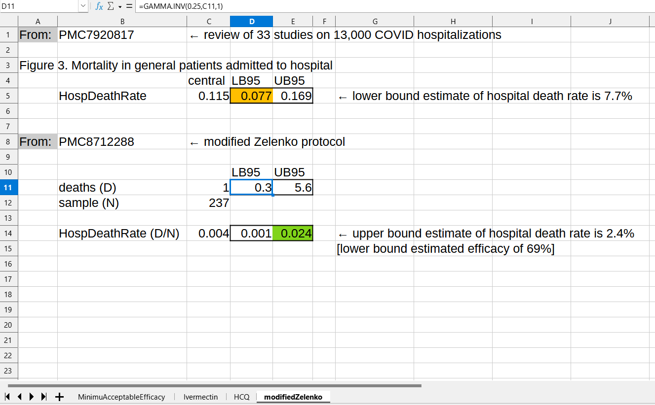In cell D5 is the lower bound hospital death rate for COVID during 2020. In cell E14 is the upper bound hospital death rate for patients taking the modified Zelenko protocol (with vitamin D added, and i.v. vitamin C in one group). Not only is there no crossover, but the difference in boundary values represents 69% efficacy against death.