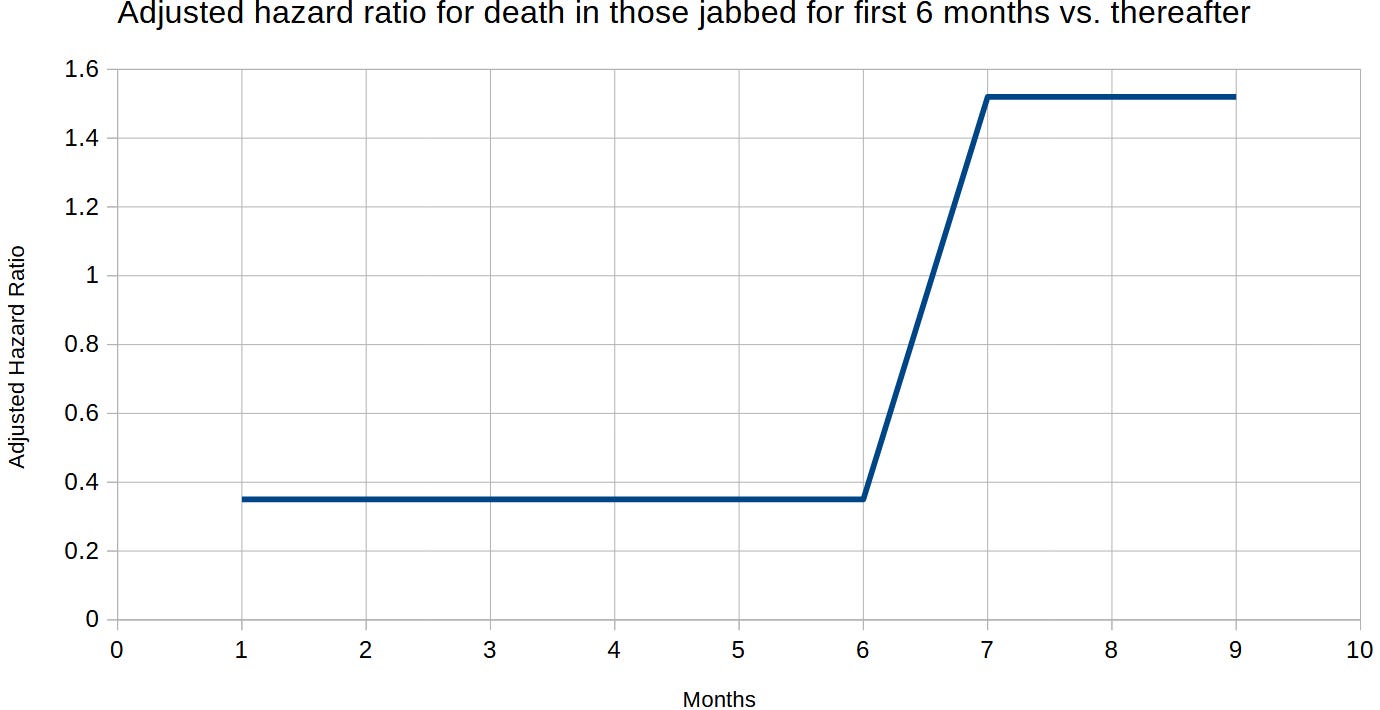 The adjusted hazard ratio in the first 6 months indicated a healthy vaccine bias that was stronger (65%), but the overall estimate is used in order to obtain a minimum. After 6 months, vaccinated people began dying at higher rates from non-COVID causes, despite being healthier people (1.0 = the rate of the unvaccinated):