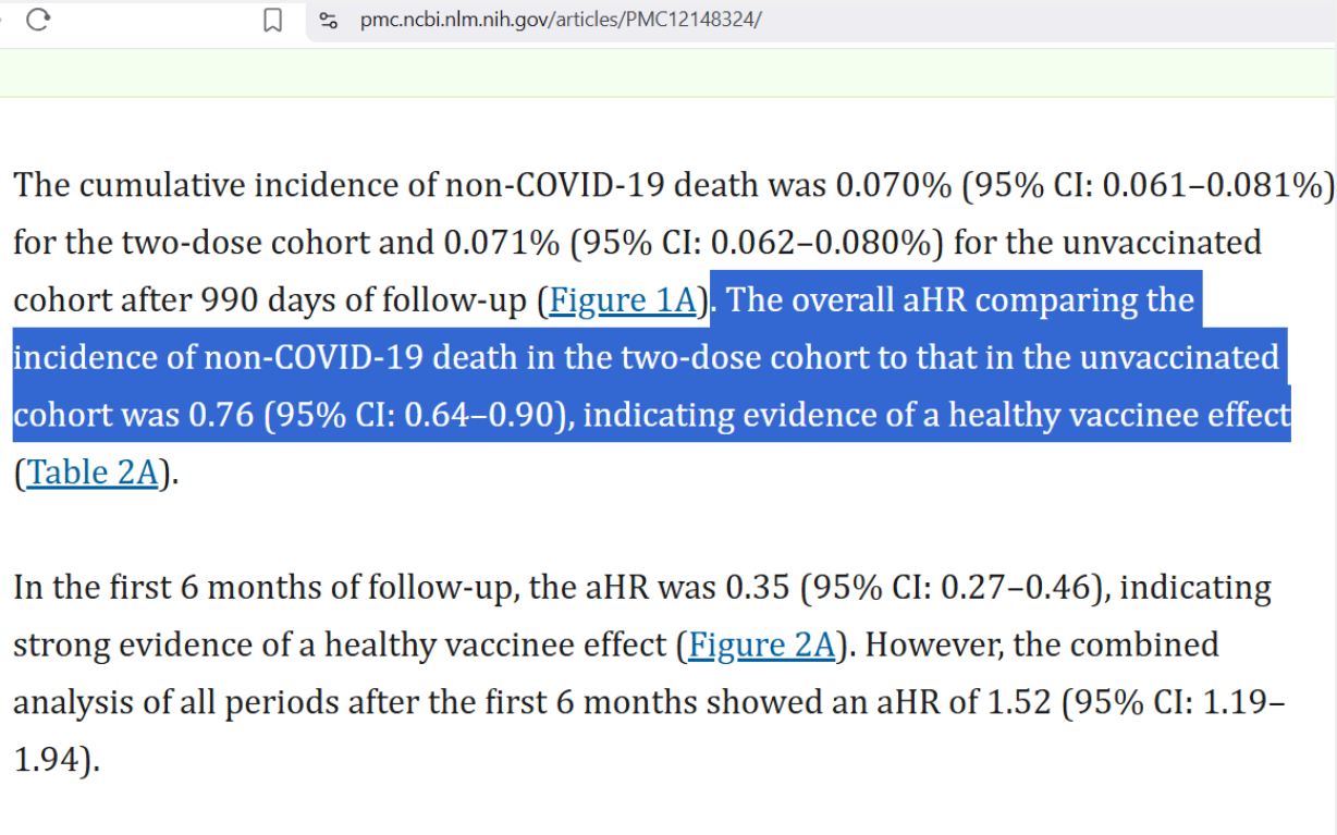 [small magnitude value of 24% healthy vaccinee bias in Qatar study] — Chemaitelly H, Ayoub HH, Coyle P, Tang P, Hasan MR, Yassine HM, Al Thani AA, Al-Kanaani Z, Al-Kuwari E, Jeremijenko A, Kaleeckal AH, Latif AN, Shaik RM, Abdul-Rahim HF, Nasrallah GK, Al-Kuwari MG, Al-Romaihi HE, Al-Thani MH, Al-Khal A, Bertollini R, Butt AA, Abu-Raddad LJ. Assessing healthy vaccinee effect in COVID-19 vaccine effectiveness studies: a national cohort study in Qatar. Elife. 2025 Jun 9;14:e103690. doi: 10.7554/eLife.103690. PMID: 40488740; PMCID: PMC12148324. https://pmc.ncbi.nlm.nih.gov/articles/PMC12148324/