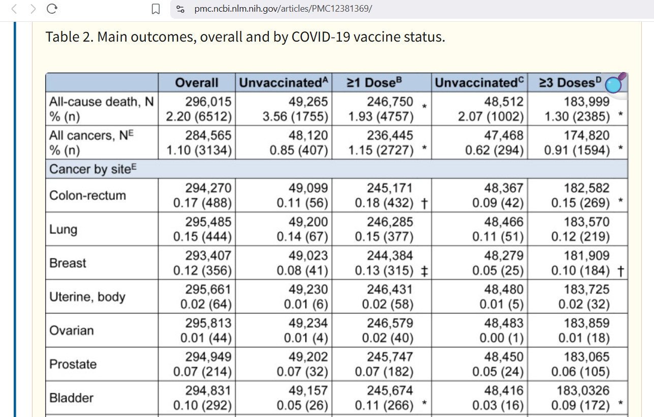 [Italian cancer risk to be corrected by the minimum healthy vaccinee bias] — Acuti Martellucci C, Capodici A, Soldato G, Fiore M, Zauli E, Carota R, De Benedictis M, Di Marco G, Di Luzio R, Flacco ME, Manzoli L. COVID-19 vaccination, all-cause mortality, and hospitalization for cancer: 30-month cohort study in an Italian province. EXCLI J. 2025 Jul 1;24:690-707. doi: 10.17179/excli2025-8400. PMID: 40881928; PMCID: PMC12381369. https://pmc.ncbi.nlm.nih.gov/articles/PMC12381369/