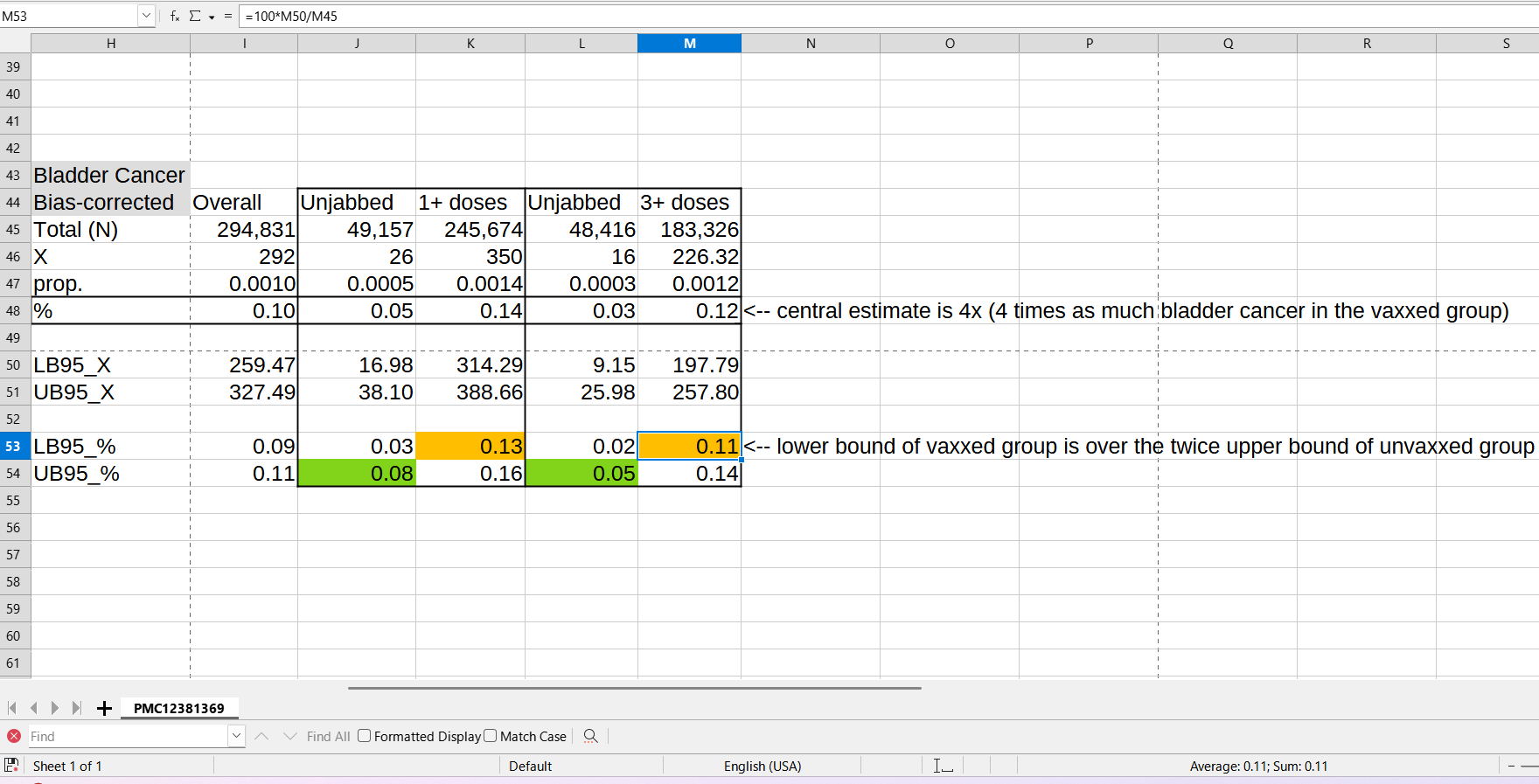 Applied to a study from Italy, we can verify the excess rate of bladder cancer in the COVID-shot-dosed subjects — under the impression that those in the vaccinated group are going to have a minimum of a 24% risk reduction for morbidity and mortality (the minimum value of a healthy vaccinee effect). Here are the reported original numbers: