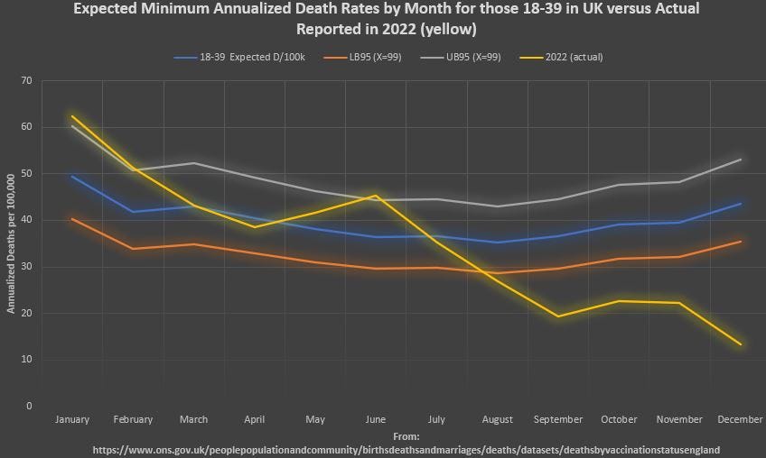 In this prior Substack, I noted how a minimum expected death rate per 100,000 on an annual basis for those of age 18-39 in England would be 40 per 100,000. Here is that rate, seasonalized, and also including error bars showing 95% confidence — with the actually-reported death rate superimposed in yellow: