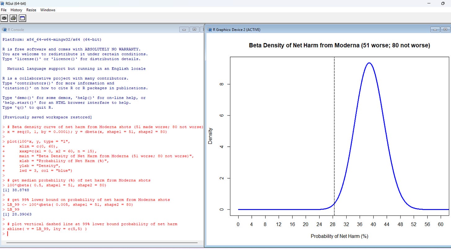At right is a graph showing “the probability of probabilities” regarding the chance that Moderna creates net harm to a person with lingering COVID symptoms (makes their unfortunate situation even worse than it had been before they took the Moderna shot). The vertical dashed line is the 99% lower bound probability (at ~28%).