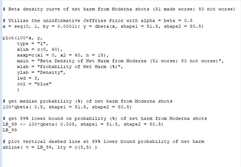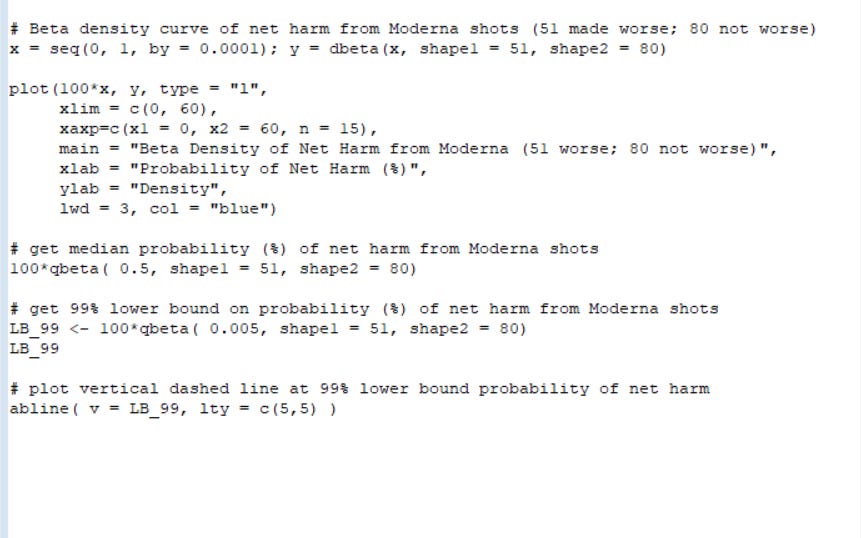 In other words, there is a 99.5% probability that the true probability of Moderna harming you is above 28% (more than 28 of every 100 people taking Moderna will be harmed). Here is the short stretch of code that would be required in order to perfectly replicate this simulation in R on your own laptop: