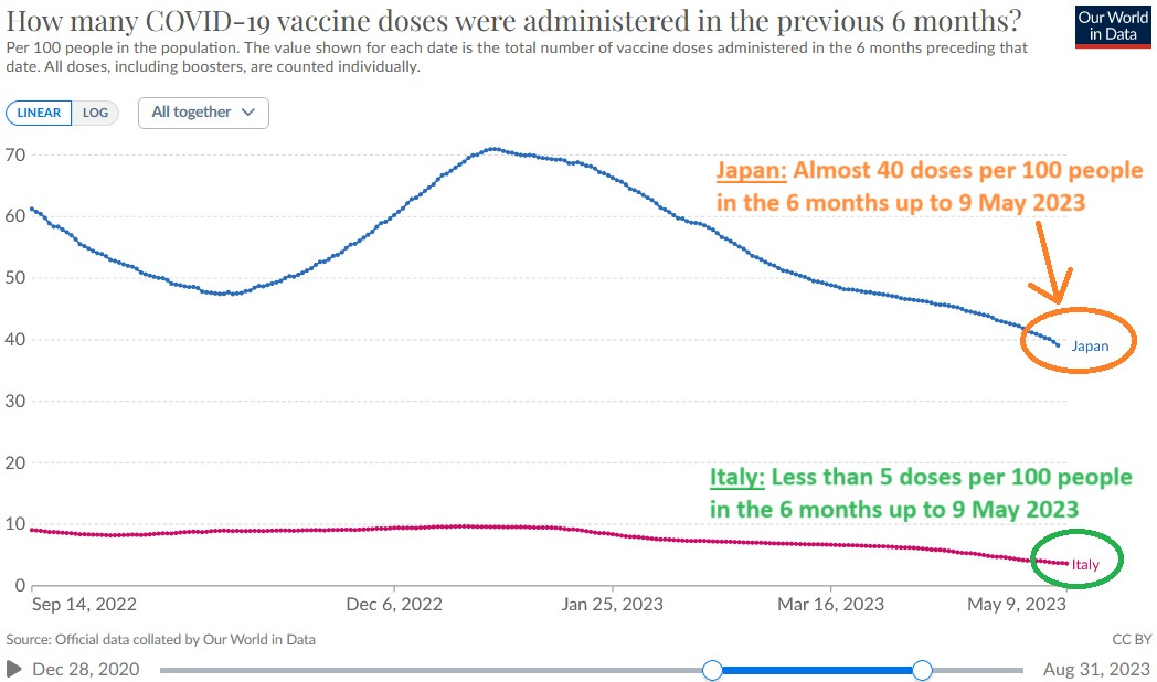 Two nations which could not be farther apart in recent COVID jab uptake are Italy and Japan. Japan has been dosing people at over 8 times the rate found in Italy: