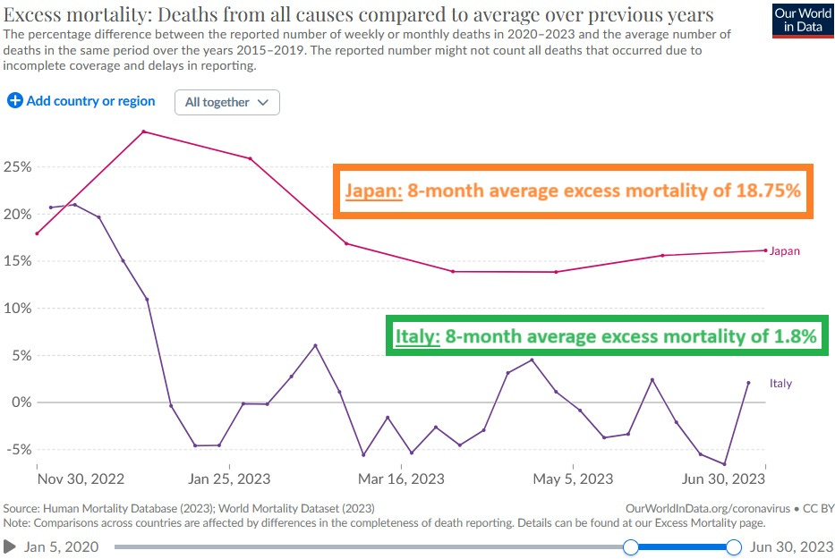 From 30 Nov 2022 up to 30 Jun 2023, Japan’s average excess death rate is 10 times that of Italy — indicating that the COVID jabs are leading to unnecessarily-high excess death in Japan.
